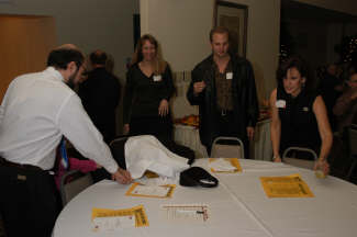The investigator takes over at that point, gathers any dropped clues and invites the audience to suggest suspects. The suspects are lined up and the guests may ask them any question. At this point in the game, only the murderer may lie; the other characters must tell the truth. (Some folks think that they can win through the use of logic games such as "Are you currently lying?" but it doesn't work that way. The murderer doesn't have to lie...) After the questioning concludes, the guests "vote" for whom they believe committed the crime. The investigator then exonerates the suspects one by one, explaining why they couldn't have been responsible. That leaves only the murderer, who usually makes an angry confession. It's very formulaic, but a lot of fun, especially when the audience is there to play. Even better, the variety of plots, the ever-changing audiences and settings, and the large pool of actors ensure that no two dinners are ever the same. I've written several plots, including: